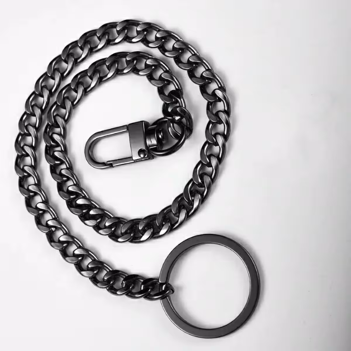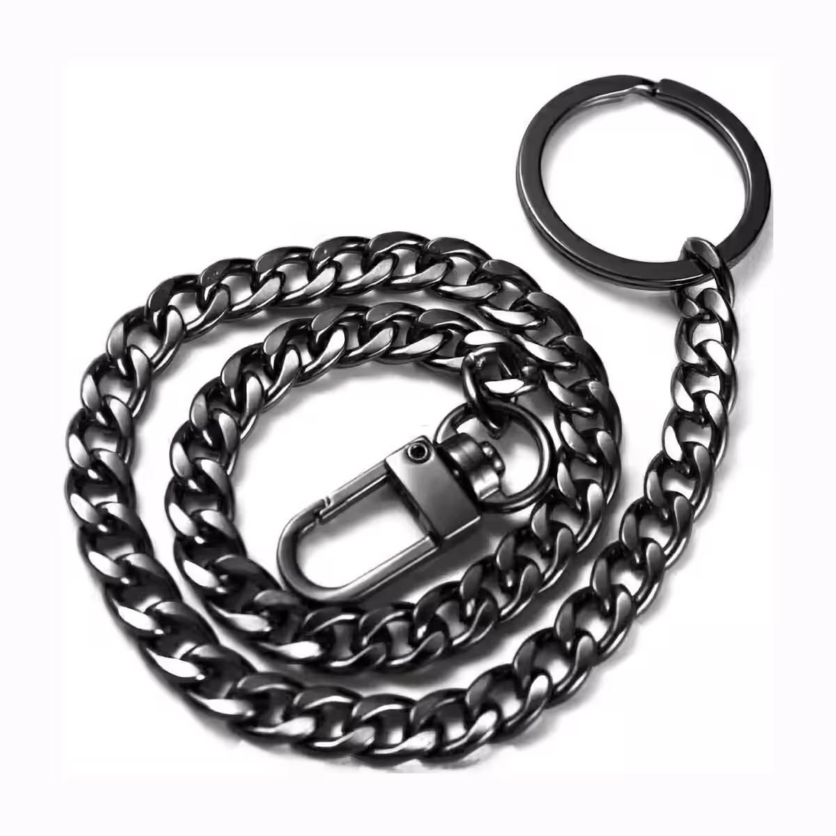 Tillverkad av hållbart rostfritt stål, har kedjan en kromat svart finish, en robust konstruktion och är utrustad med en Snap-On lås i ena änden och en nyckelring i den andra. Den kan enkelt fästas på jeans, militärbyxor, raka byxor eller de med hängande ben.