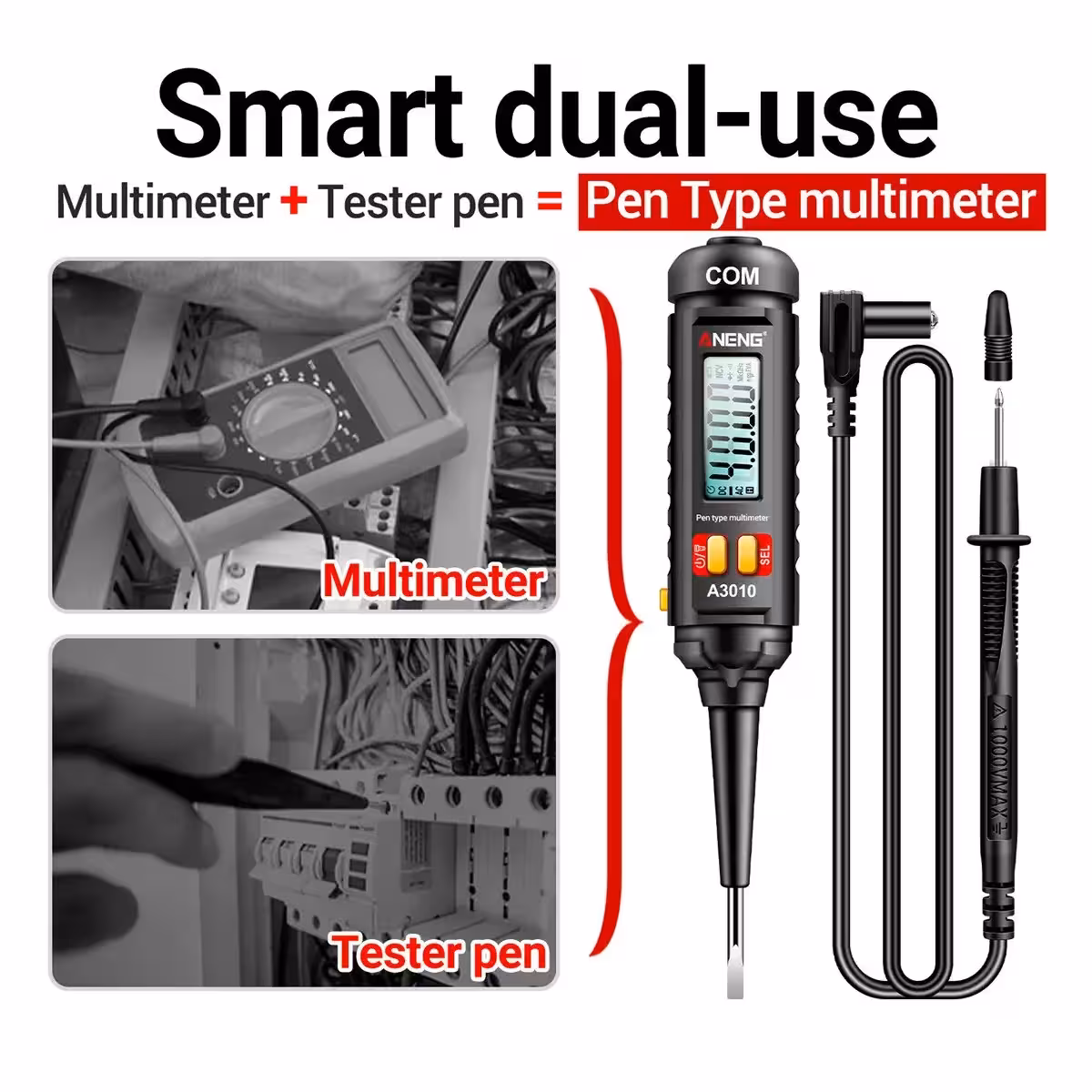 Upptäck en multifunktionell spänningstester idealisk för bildiagnostik, DIY-elprojekt och hushållsreparationer. Denna digitala spänningspenna mäter AC/DC-spänning, resistans, frekvens och inkluderar NCV-funktion, True-RMS och belyst display. Ett måste för alla yrkesverksamma eller elektronikentusiaster.