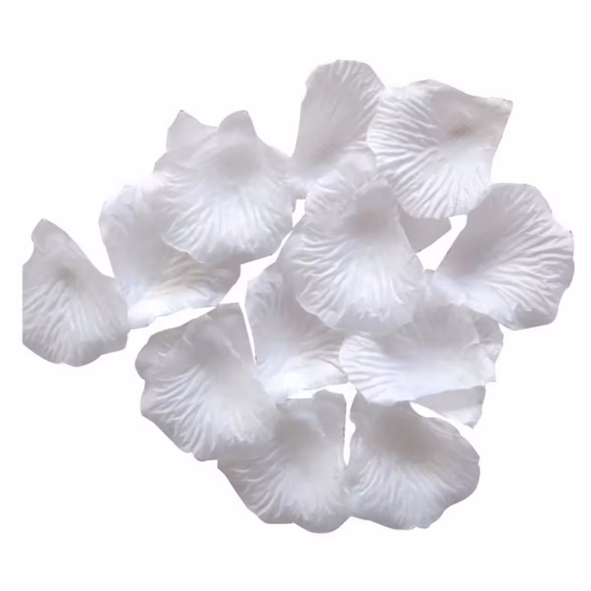 Set med konstgjorda vita rosblad, tillverkade av högkvalitativt textilmaterial som inte färgar av sig eller klibbar.