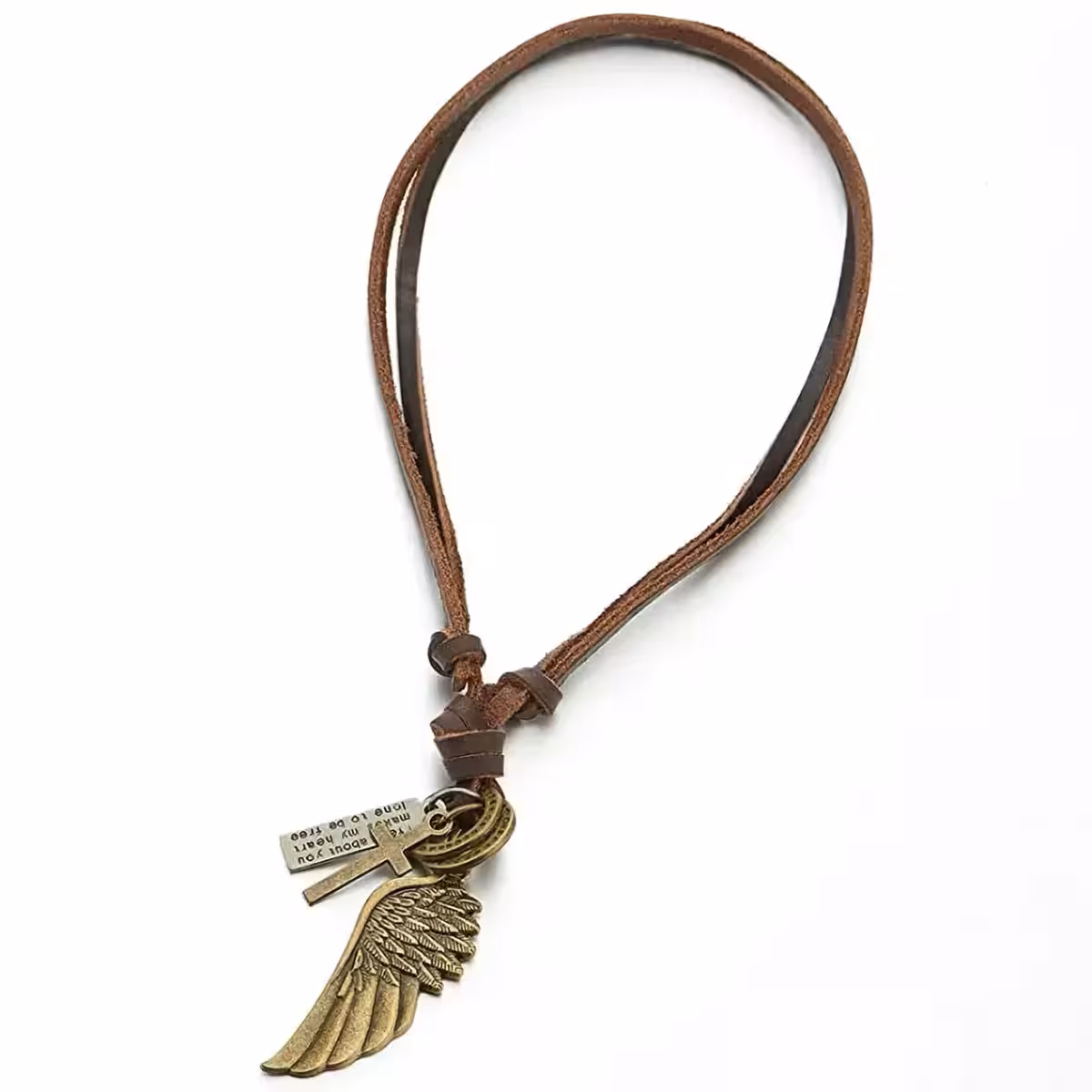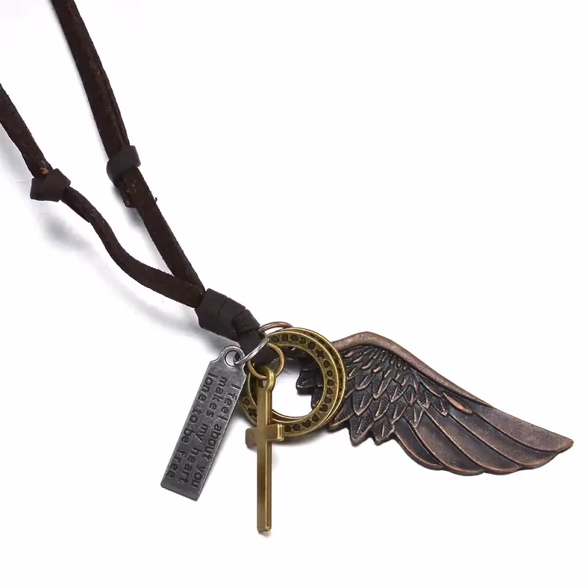 Detta halsband kombinerar högkvalitativt naturligt läder med ett hänge i zinklegering, som föreställer en änglavinge och ett subtilt kors, vilket ger en distinkt och sofistikerad känsla.