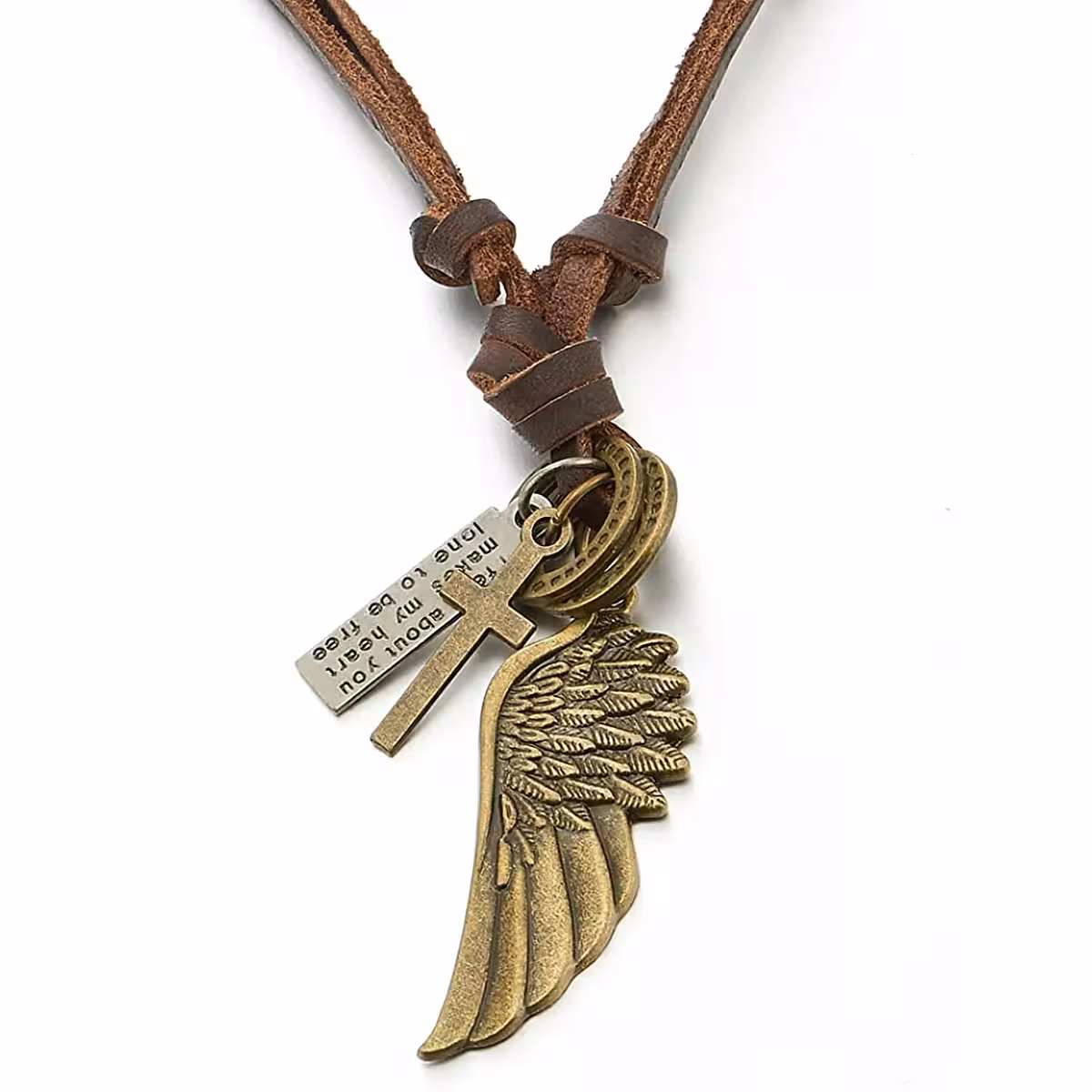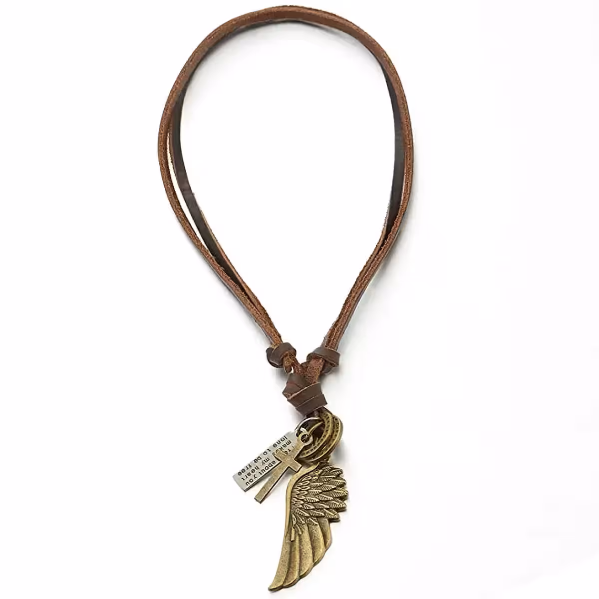 Detta läderhalsband med änglavinge och liten kors är ett inspirerat val för män som söker en accessoar med betydelse och autentisk stil.