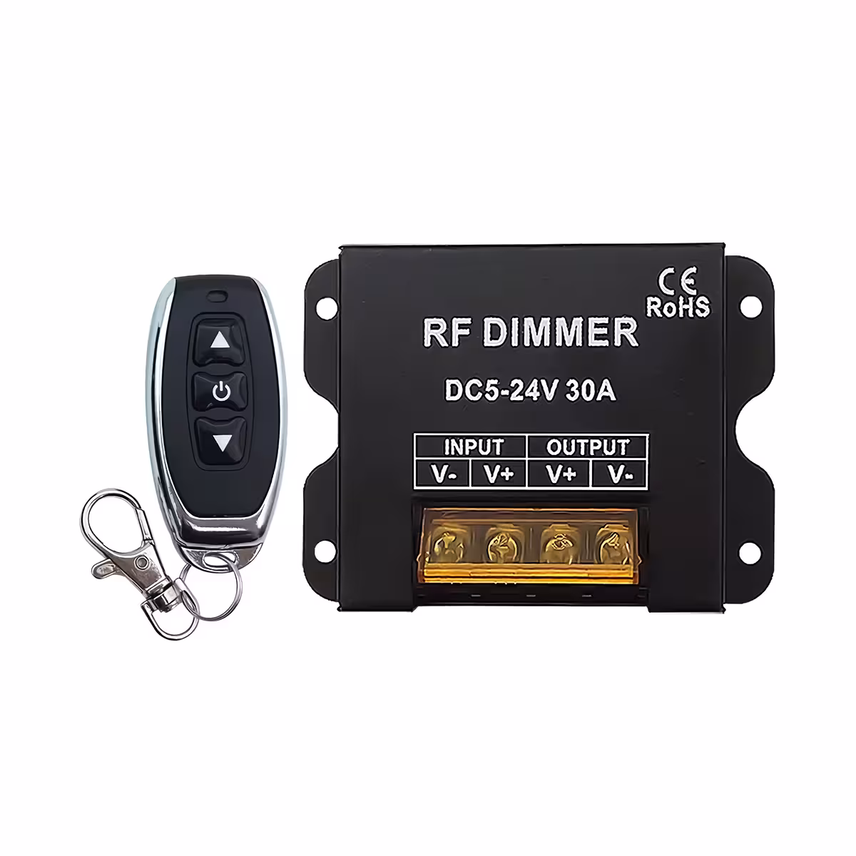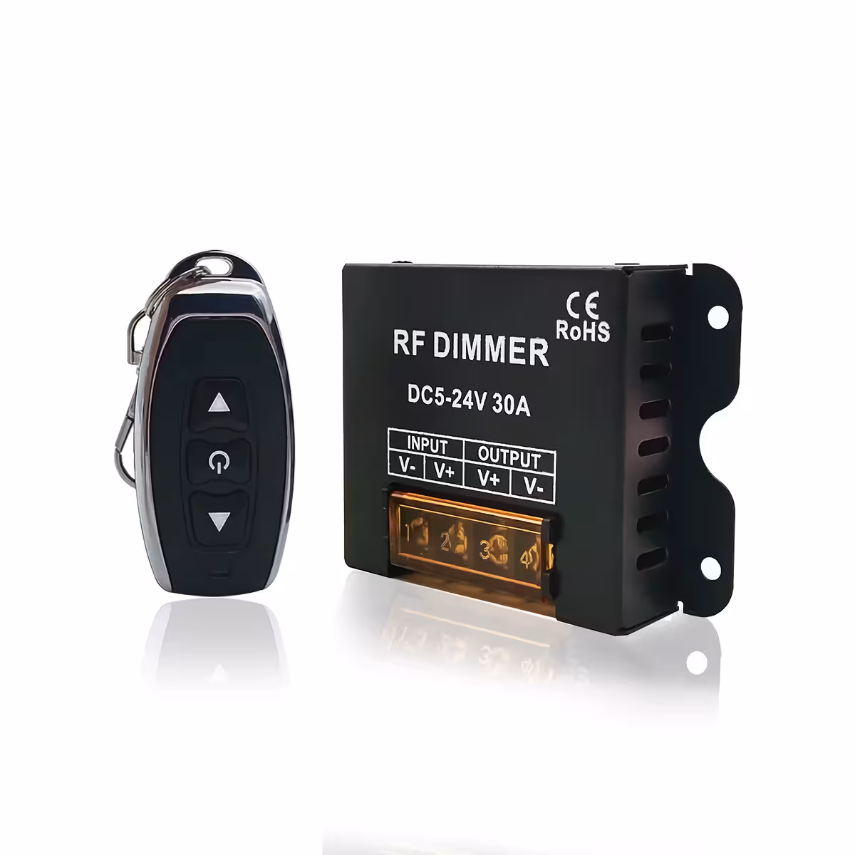 Denna LED dimmer, kompatibel med 12V och 24V spänningar, är en DC 5-24V, 30A-controller utrustad med en RF wireless fjärrkontroll med 3 knappar.