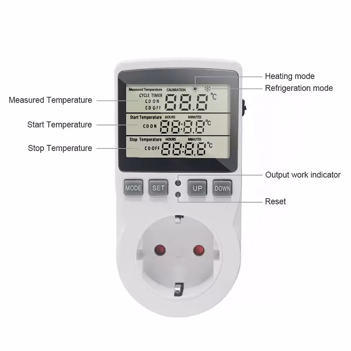 Digitalt kontrollerat uttag med termostat, idealiskt för exakt temperaturkontroll i bostäder och kommersiella utrymmen. Kompatibelt med elektriska radiatorer, termisk plasma, luftkonditioneringsapparater, fläktar, växthus, akvarier och annan utrustning som kräver automatisk temperaturkontroll.