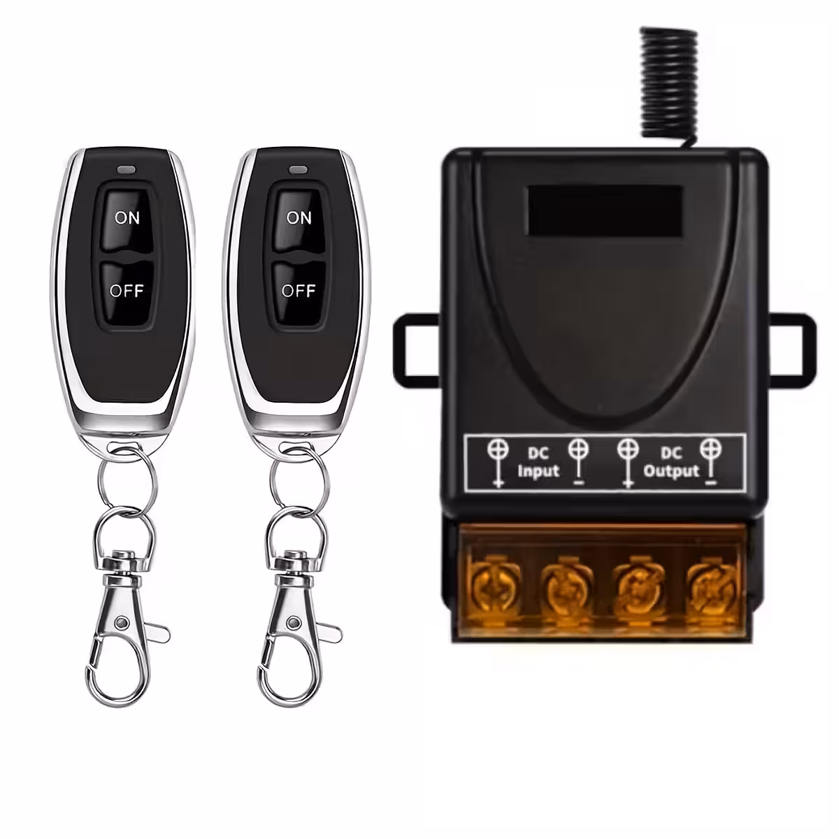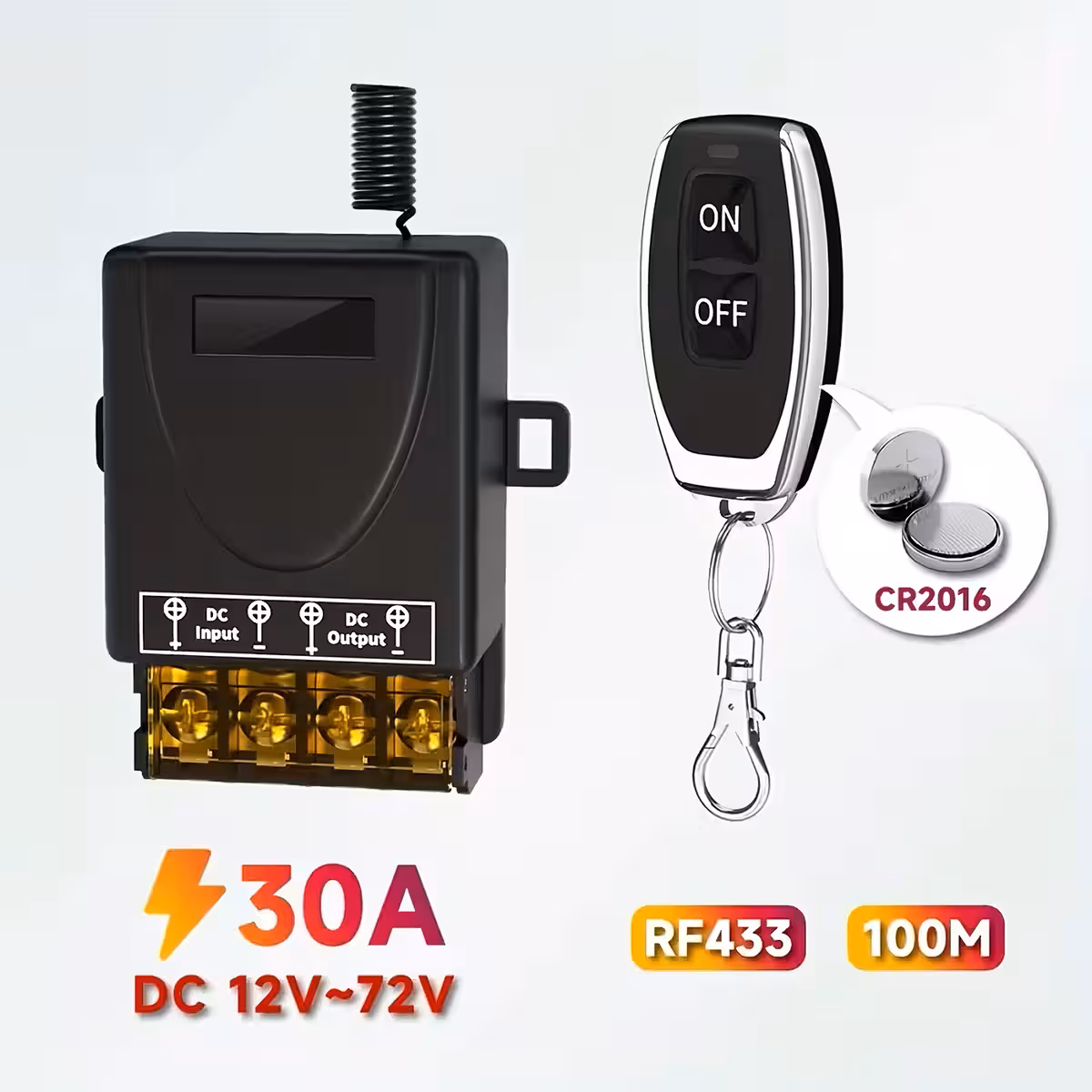 Denna 12V–60V 30A fjärrstyrda relä är en högkapacitetsbrytare, idealisk för fjärrstyrning av pumpar, lampor, maskiner, uttag, fordons- eller hemanläggningar samt smarta heminstallationer. Den arbetar på RF-frekvensen 433,92MHz och levereras med 2 fjärrkontroller.
