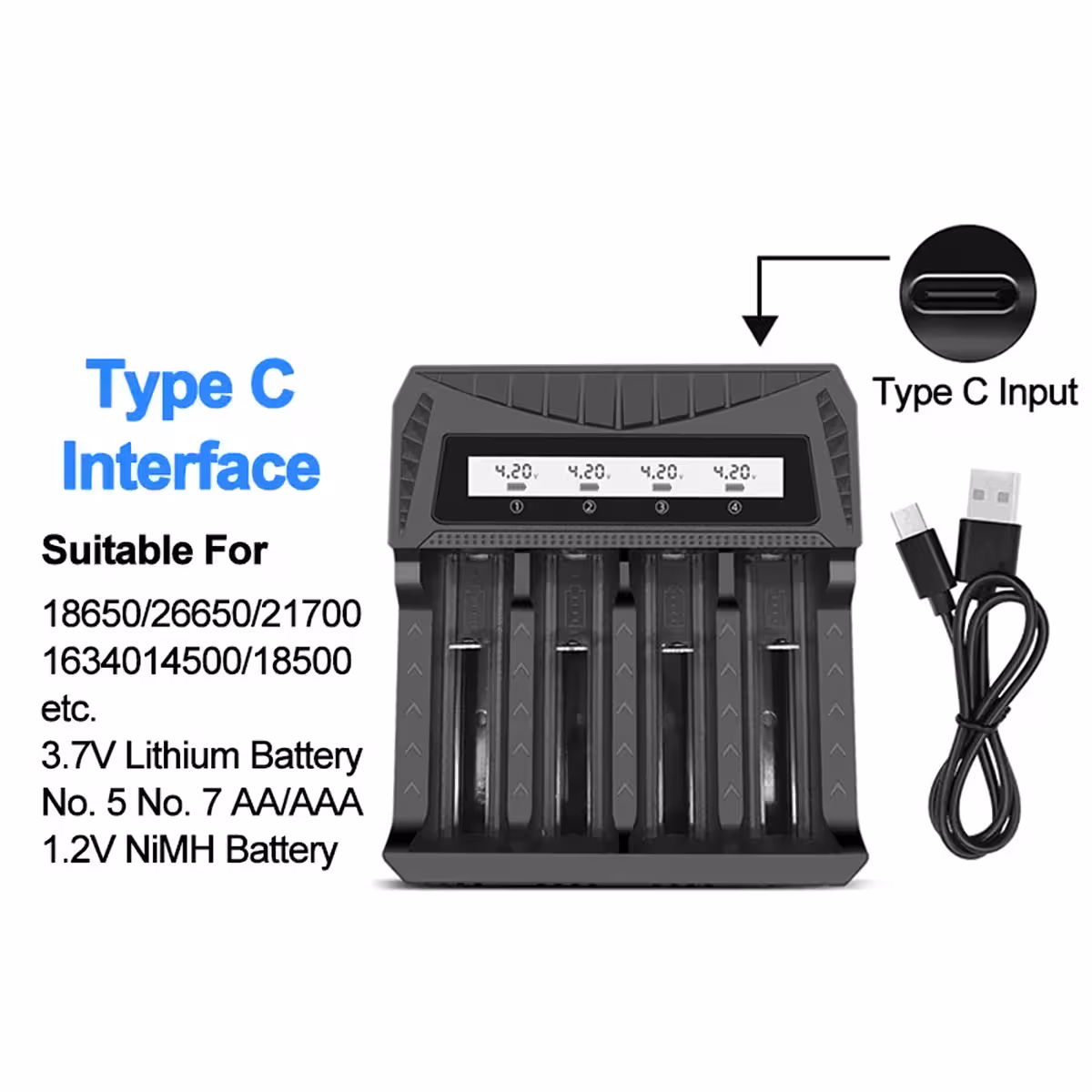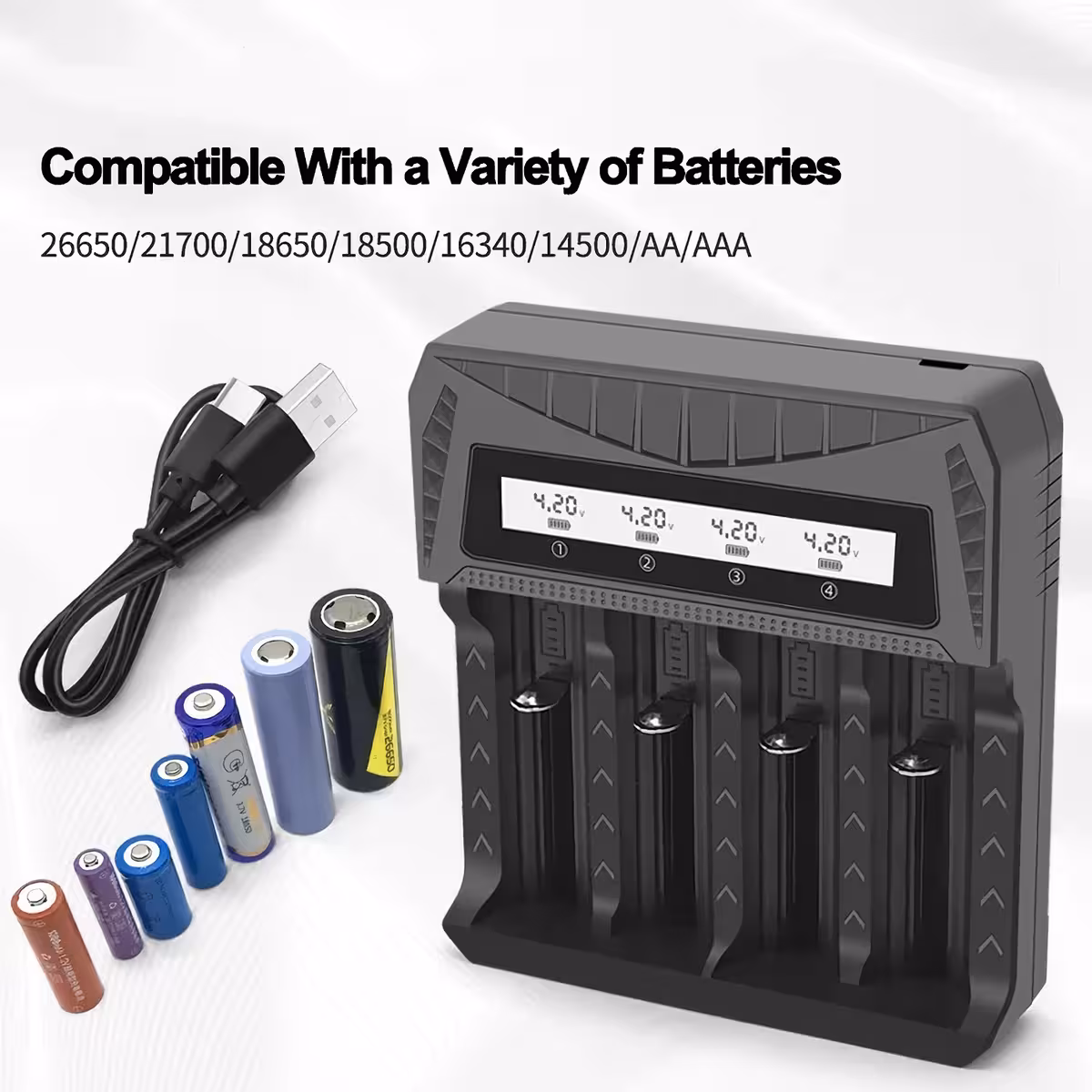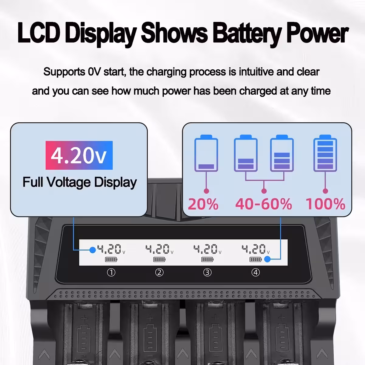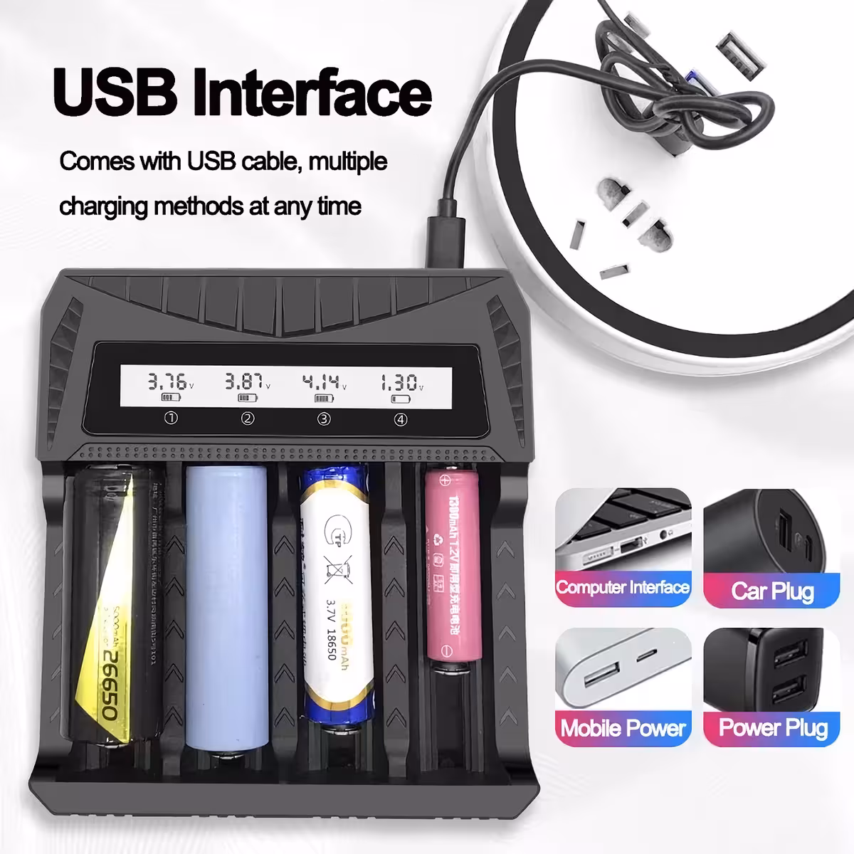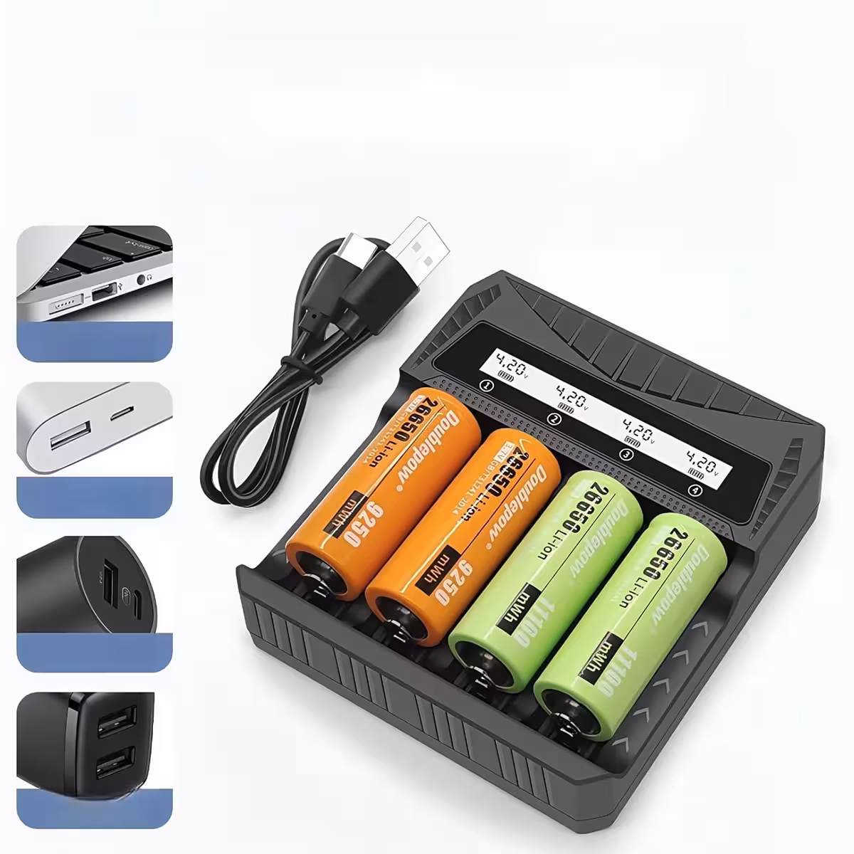 Universell 18650-laddare med LCD-display och 4 oberoende fack