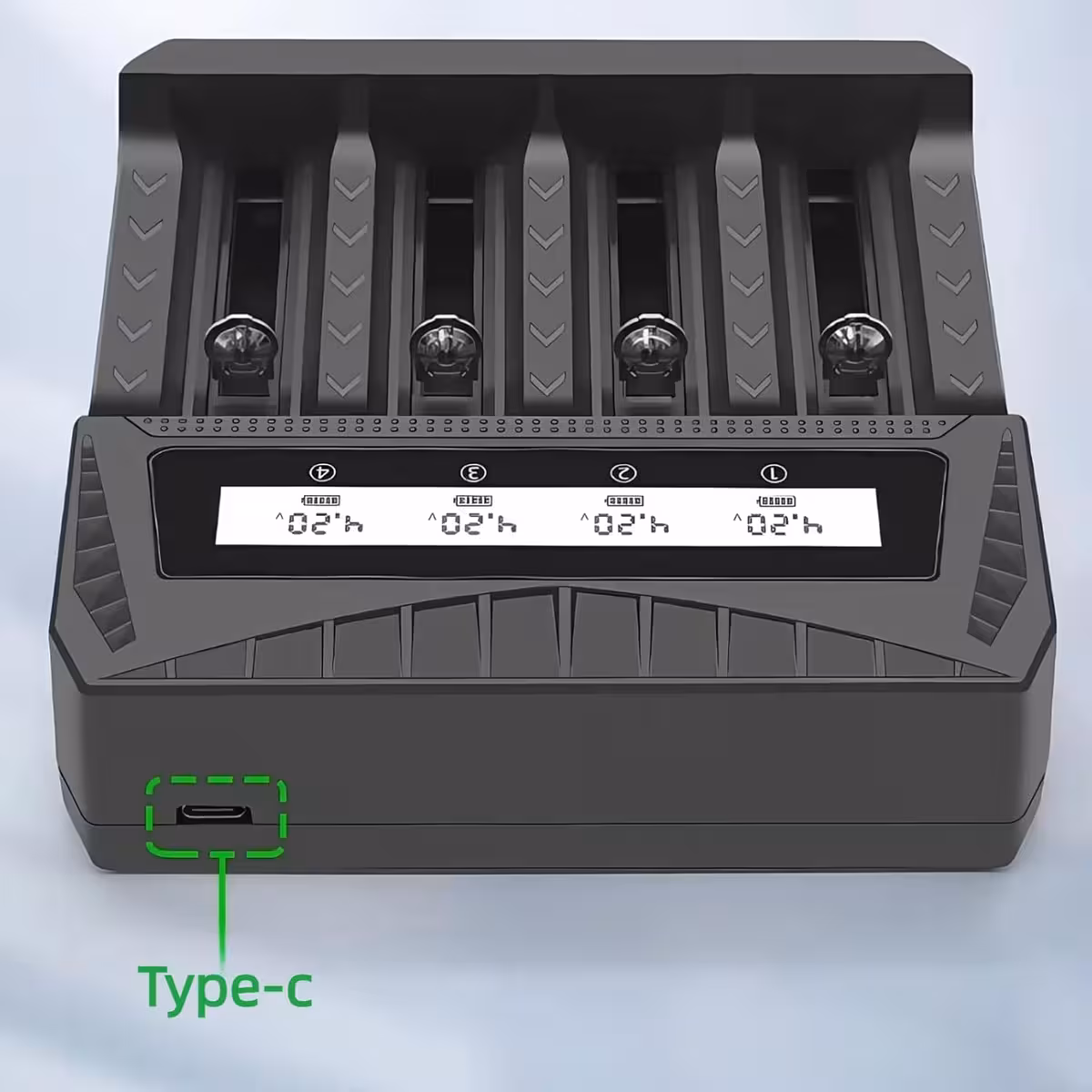 LCD-displayen ger tydlig information om varje laddkanals status. Strömförsörjning sker via USB-C 5V-2A, kompatibel med väggladdare, powerbanks eller datorer.